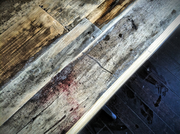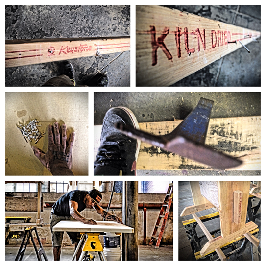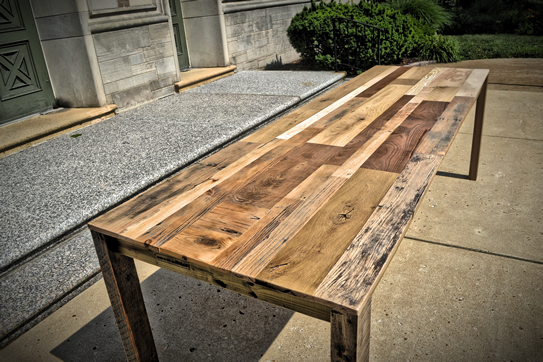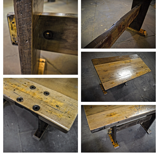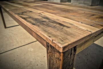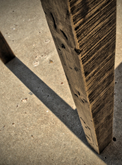sin: represented by the torn, warn and rustic wood on one end of the table. some areas show full, visible and imbedded nails, as opposed to just the nail heads that we normally show when doing a very rustic piece of furniture. according to the Bible, nails played a very crucial roll in the crucifixion of Jesus Christ, so i thought having pronounced and very visible, full nails in the wood could capture that part of the crucifixion in a very clear way. these large nails are visible in two of the legs on this side of the table. i've also placed two boards horizontally in the table top, to draw firm contrast against all the other boards in the table top. these horizontal boards represent a heightened level of opposition to Christ, to the point were it's going in a completely different direction — these particular boards are also the most rustic boards on the table top: 100-year-old barn wood siding exposed to over 100-years of the outdoor elements that changing seasons bring. it is hardened, and once covered in red lead paint.