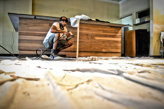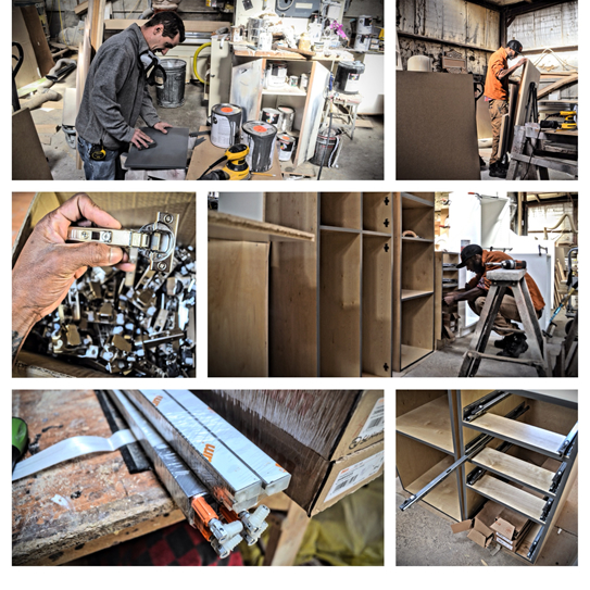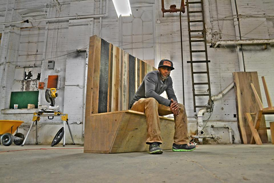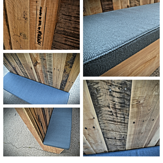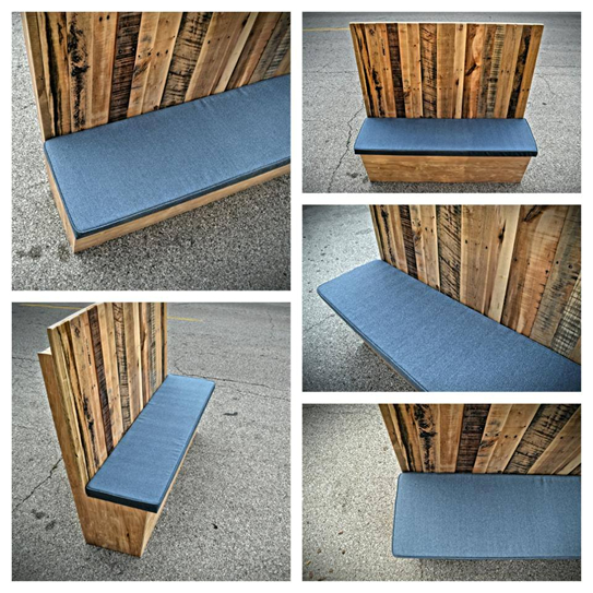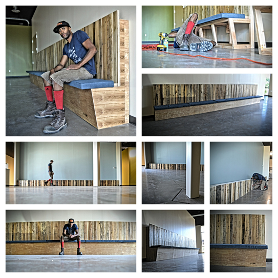 we’re also fabricating and installing 20-feet worth of continuous, custom banquettes out of repurposed shipping pallet wood with a handmade upholstered seat, and cladding a feature “mailbox wall” with repurposed shipping pallet wood. all work will be sealed with a zero-VOC, satin topcoat finish.
