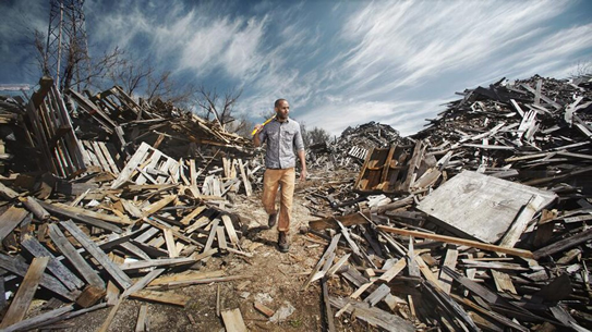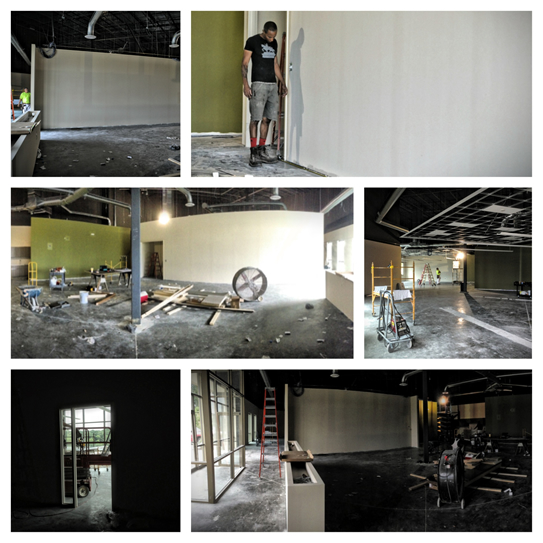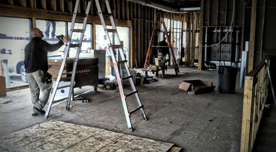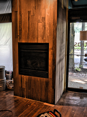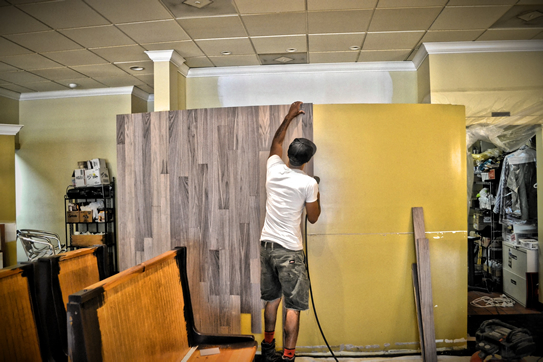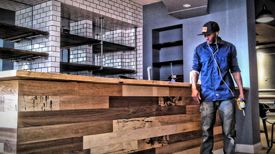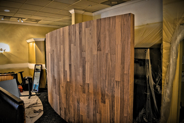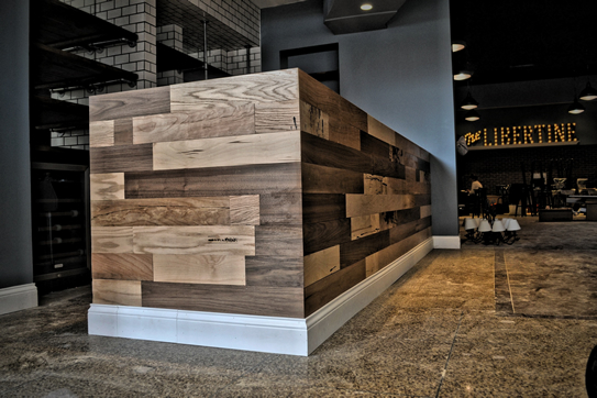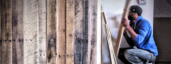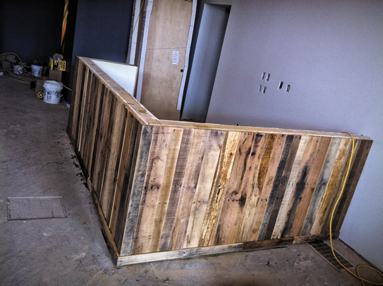 plus, we've been asked to create an accent wall that measures approximately 11-feet high by 7-feet wide at the north-east corner of the restaurant (shown on the right in photo below) by cladding it with repurposed shipping pallet wood in a vertical orientation pattern.