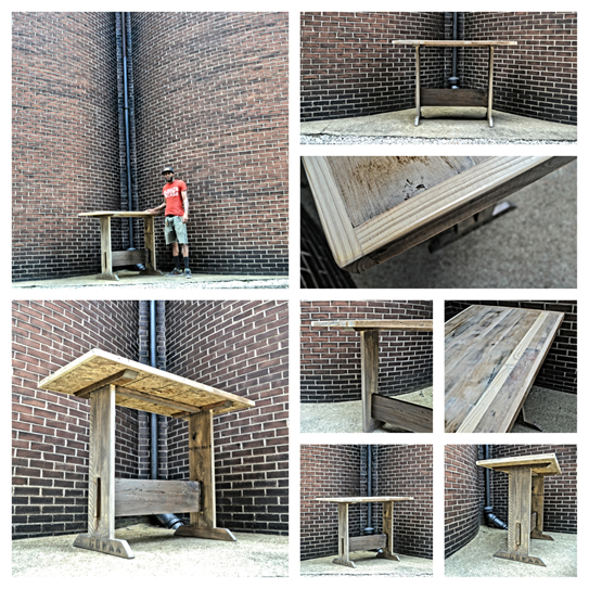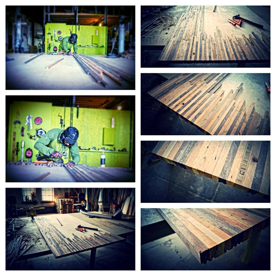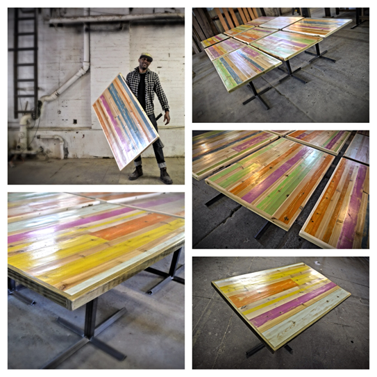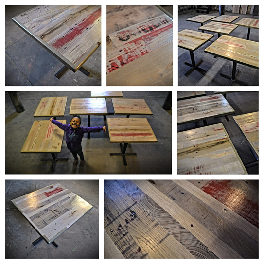 all the "restaurant style" tables for INTERNATIONAL TAP HOUSE (iTAP) ( www.internationaltaphouse.com ) at the new Central West End location have now been completed, made 100% out of repurposed shipping pallet wood and treated with a custom wood stain color. now it's time to move on to the two bar height community tables for the top floor of the space.