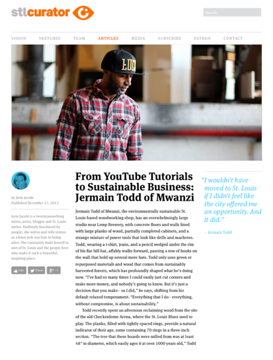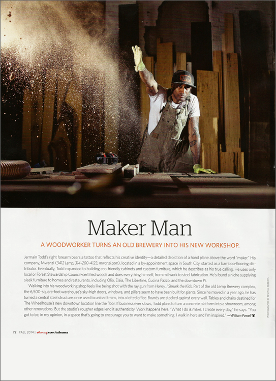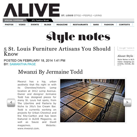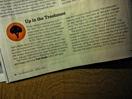 PRESSE / we got a little shine in the APRIL 2013 issue of ALIVE MAGAZINE for our upcoming work for the soon to open vegetarian restaurant on south grand, TREE HOUSE VEGETARIAN RESTAURANT (treehousestl.com). we've designed and will fabricate the restaurant's bars on both the first and second floor using a tasteful mélange 100-year-old repurposed woods from old warehouse carts made in the late 1800's by Nutting® and acquired from an old paper mill in Chicago, and some locally foraged shipping pallet wood.