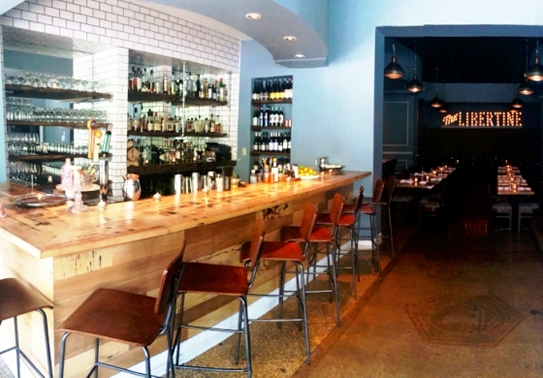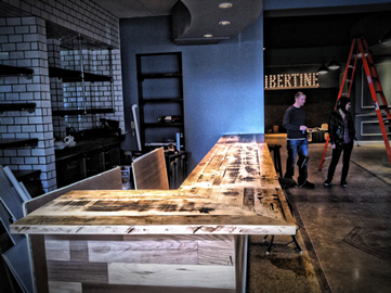 after nearly six weeks of fabrication and installation work, our project for THE LIBERTINE is completed. what an amazing ride it was. big shout out to NICK & AUDRA LUEDDE and CHEF JOSH GALLIANO for giving me the creative freedom to realize their vision for the space. what an amazing group of people. this project included building their entire bar, a 24-foot-long wraparound window bar, and fabricating the restaurant's 32 tables. several restaurant fabrication and design firsts happened in this project, but most notable are the tables. this is the first restaurant in the country to have tables made on this scale — 32 in total, out of 100-year-old repurposed woods. can't wait to enjoy a meal and a few local beers here. opening day is May 14th!