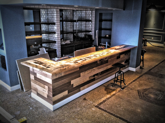 THE BAR / PHASE TWO / the bar at The Libertine is pretty much finished except for a section at the south-west area of the bar top that will lift up and allow staff in-and-out of behind the bar and a drink rail along the inside perimeter of the bar. we'll take care of that sometime next week when we begin framing out the window bar, which will span the entire window on the south side of the space and continue along the east wall in the bar area.